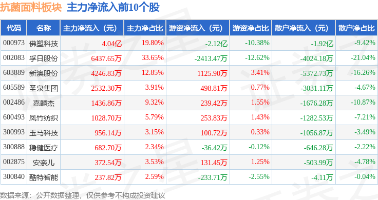 从资金流向上来看,当日抗菌面料板块主力资金净流入5.28亿元,游资资金净流出2.31亿元,散户资金净流出2.97亿元。抗菌面料板块个股资金流向见下表: